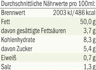 Rapsöl (50%), Wasser, Glukose-Fructose-Sirup, Eigelb, modifizierte Maisstärke, Branntweinessig*, Speisesalz, Konservierungsstoff: Kaliumsorbat; Säuerungsmittel: Citronensäure; Antioxidationsmittel: E385. * Österreich: Weingeistessig