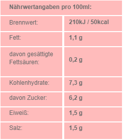 Tomaten* (50%), Tomatenmark* (22% einfach konzentriert), Zwiebeln* (3%), Rohrohzucker*, Karotten*, Sellerie*, Zuccini*, Maisstärke*, Steinsalz, Olivenöl*, Kräuter*, Gewürze*, Knoblauch* (0,2%), Zitronensaft*.